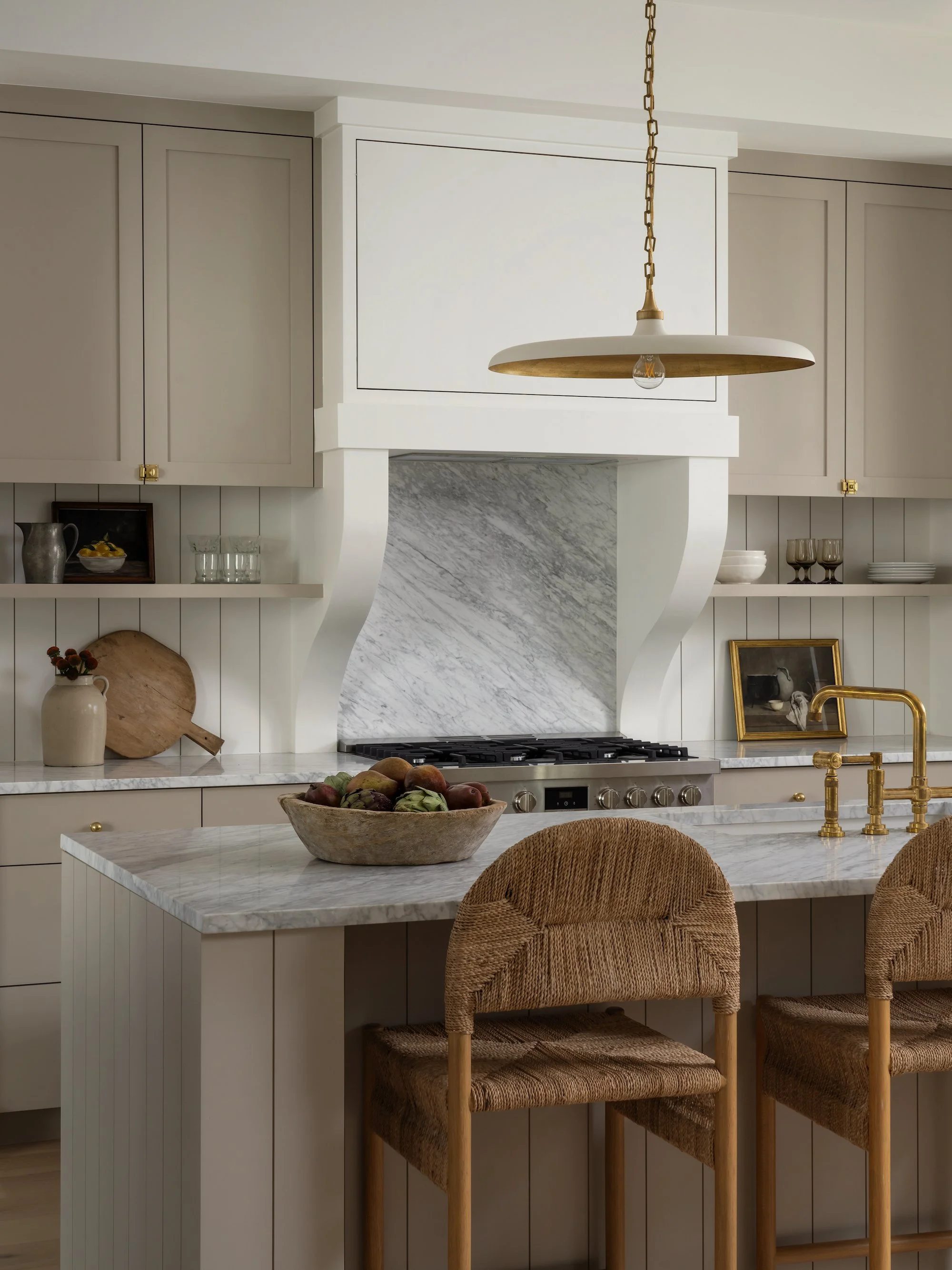 The shape of the range hood sets the tone for unique curvature and soft arches, a design element that is repeated throughout the home.