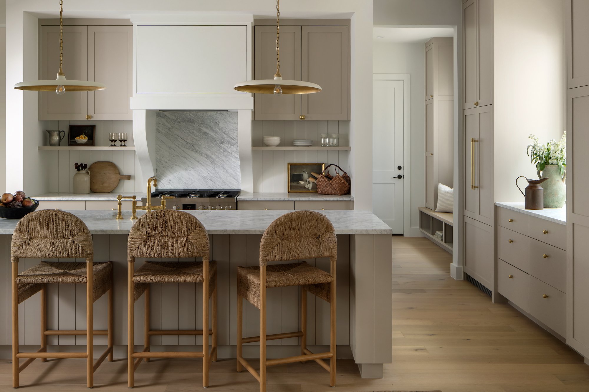 When designing the Everglade Project, Lauren hoped to move away from the “modern farmhouse” trend and embrace the idea of “modern cottage.” Instead of horizontal shiplap, we opted for beadboard and vertical tongue-and-groove wall detailing. Instead of an all-white color palette, we incorporated warm taupe and soft grey paint colors. Instead of cool metal finishes such as matte black or chrome, we selected unlaquered brass, oil rubbed bronze, and polished nickel finishes that would age beautifully over time. Each design selection was made to intentionally create the feeling of a warm, inviting, easy-to-embrace cottage with all the luxuries and functionality of a modern new build.